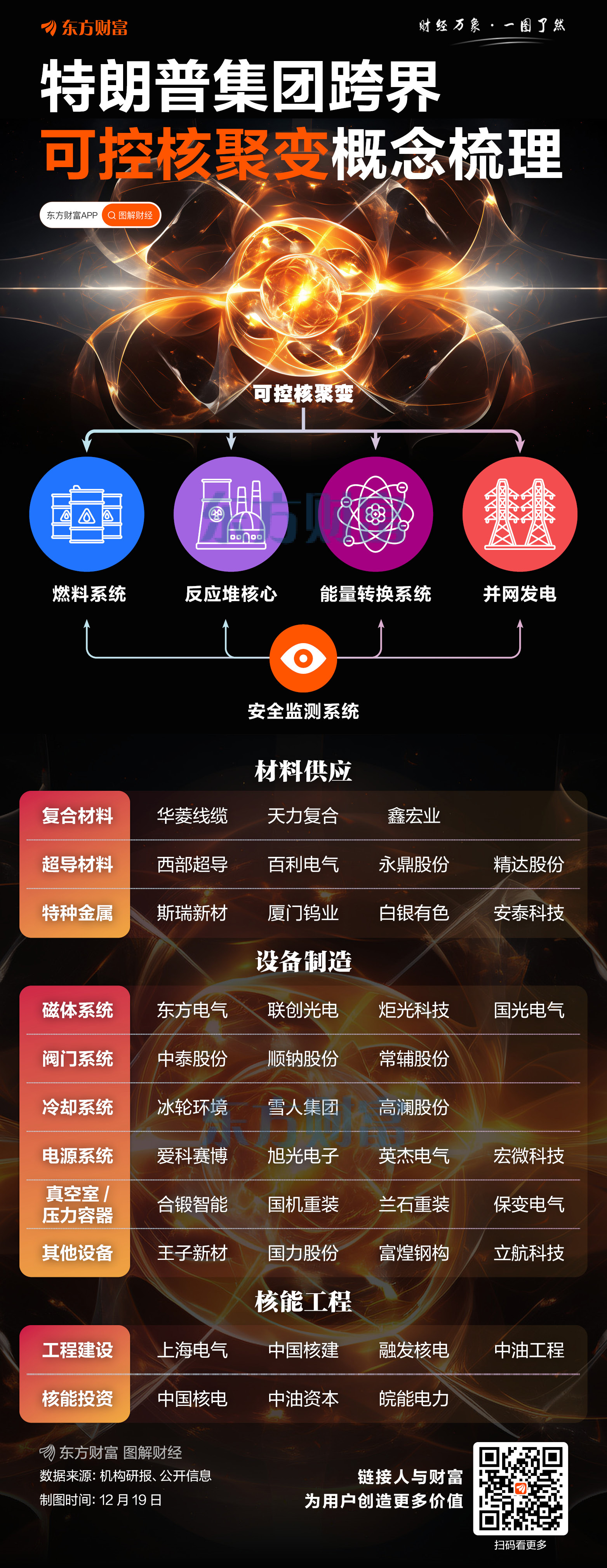 ![]() 周五(12月19日)可控核聚变概念股再度爆发,宏微科技涨超12%,王子新材、百利电气、雪人集团等多股涨停。 消息面上,当地时间周四,特朗普媒体与科技集团(DJT)已同意与一家获得Alphabet支持的核聚变能源公司进行全股票交易合并,交易总价值超过60亿美元。此次合并将使双方共同建设一系列大型聚变发电厂,以满足人工智能(AI)浪潮带来的能源需求。周四,DJT股价大幅飙升,涨幅超过40%。 根据协议,交易完成后,特朗普旗下的媒体公司与TAE Technologies的股东将各自拥有合并后公司约50%的股份。交易预计于2026年年中完成,每股TAE股票定价为53.89美元。 两家公司声明称,此次合并将结合DJT“获取巨额资本的能力”与TAE的“领先聚变技术”,旨在为AI技术提供电力支持。 合并后的公司计划于2026年选址并开始建设“全球首座公用事业规模聚变发电厂”,初期发电能力为50兆瓦,需获得相关审批。未来将建设更多聚变电厂,整体发电能力预计在350至500兆瓦之间。 综合机构观点看,可控核聚变发电的核心环节包括燃料系统、反应堆核心、能量转换系统、并网发电及安全监测系统。 浙商证券表示,核聚变由于燃料丰富、能量密度大、无污染等优点,被认为是人类未来的终极能源,因此也成为大国下一代科技竞争的前沿阵地。 申万宏源研报指出,随着技术的持续突破、政策不断落地以及国内相关装置建设加速,核聚变技术的工程化与商业化进程有望加快。国际能源署则预测,到2030年,全球核聚变市场规模有望接近5000亿美元(3.5万亿元人民币)。 国泰海通证券表示,可控核聚变行业招标显著加速。近日,中科院合肥物质院等离子体所、聚变新能(安徽)有限公司持续更新多项采购信息,累计预算金额数千万元,采购需求仍在不断增加。核聚变仪器采购需求不断增加,行业招标显著加速。