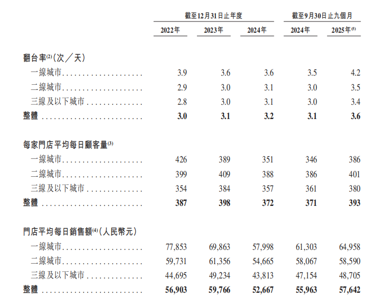 今年前三季度净利润增近六成,未来三年加速渗透下沉市场 具体来看财务数据,巴奴火锅业绩实现持续增长。2022年至2024年以及截至2025年9月30日止九个月收入分别为14.33亿元、21.12亿元、23.07亿元和20.77亿元。据记者计算,2023年同比增长47.3%,2024年同比增长9.3%,增速同比放缓。2025年前三季度同比增长24.5%,主要由于标准化和精细化运营,显著提升了整体经营效率。 ![]() 财务数据 年内利润方面,2022年巴奴录得净亏损0.052亿元,2023年扭亏为盈,实现净利润1.02亿元,2024年净利润增长至1.23亿元,同比增长20.8%,今年前三季度净利润进一步增长至1.56亿元,同比增长58.5%。 对比同样在港股上市的海底捞,2022年至2024年实现营收分别为311.41亿元、416.22亿元、427.55亿元,其中2022年同比下滑20.65%,2023年和2024年分别同比增长33.66%和3.14%。过去三年年内利润为16.37亿元,44.95亿元和47亿元,其中2022年实现扭亏,2023年和2024年分别同比增长1.75倍和4.6%。 盈利模型上,招股书介绍,巴奴经营的餐厅通常于开业约二至四个月内实现首次收支平衡,于往绩记录期间开业并于最后实际可行日期仍在经营的餐厅的投资回报期为14个月。具体来看巴奴门店的业务数据,过去三年门店经营利润率稳步提升,分别为15.2%、21.3%、21.5%。今年前三季度为24.3%,上年同期为21.0%。 巴奴过去三年整体翻台率分别为3、3.1、3.2次/天,今年前三季度为3.6次/天。对比海底捞餐厅平均翻台率,2022年至2024年分别为3.0、3.8和4.1次/天。过去三年,巴奴顾客人均消费呈轻微下降趋势。招股书指出,由于主要通过积极调整产品组合拓展客群,并扩大竞争优势以应对市场趋势。2022年至2024年分别为147元、150元、142元,今年前三季度为138元,和去年同期的142元相比略有下滑。 ![]() 业务数据 对比海底捞,顾客人均消费从2022年的104.9元减少至2023年的99.1元,变动主要由于优惠增加,再减少至2024年的97.5元,主要由于菜品消费结构变化。 同店销售额主要受翻台率及顾客人均消费影响。巴奴招股书指出,同店销售额于2022年至2023年增长22.6%,主要是由于疫情后运营恢复正常且运营能力增强,进而推动所有主要市场的客流量大幅回升。相比之下,同店销售额于2023年至2024年下降9.9%,由于巴奴主要通过积极调整产品组合扩展客群,并扩大竞争优势以应对市场趋势,致使顾客人均消费从2023年的150元减少至2024年的142元。截至今年9月30日,同店销售额增长4.3%,主要是由于同店翻台率从3.1增至3.5,尽管同期顾客人均消费从148元下降至138元。 ![]() 顾客人均消费数据 截至最后实际可执行日期,巴奴直营门店网络已覆盖全国46个城市,门店数量达到162家,较2021年末增长95.2%。巴奴有5家集仓储物流于一体的综合性中央厨房,1家专业化底料加工厂,覆盖中国14个省及直辖市。截至今年9月30日,巴奴在二线及以下城市占餐厅总数的80.1%。今年前三季度,一线城市门店的经营利润率为21.3%,二线及以下城市门店经营利润率为25.2%,根据弗若斯特沙利文的数据,均高出全国行业平均水平。 ![]() 门店数量 招股书指出,未来增长取决于开设及经营新门店的能力以及维持盈利能力。在开店计划方面,巴奴将加密已建立品牌势能的重点城市的餐厅密度,并向周边地县级市拓展。具体来看,巴奴计划于2026年至2028年在中国分别开设约52家、61家及64家新餐厅。预计每家新餐厅的前期投资一般不超500万元,具体金额可根据不同城市及餐厅模型差异灵活调整。就城市线级而言,2026年至2028年拟新开设的门店中,大多数将落脚于拥有庞大目标客群的二线城市和三线及以下城市。 值得注意的是,未来三年计划开店速度远高于招股书披露的过去三年新增门店数据,过去三年分别新开11家、25家、35家。按照2026年至2028年开店计划,未来三年将新开约177家门店,是目前162家门店的1.1倍。不过,招股书也指出,公司审慎控制新店开设节奏,并通过投资后回顾机制密切监督餐厅拓展。如发现因密度过高或布局重叠导致餐厅业绩承压的情况,将调整拓展计划或优化餐厅分布。此外,往绩记录期间,关闭餐厅主要由于租赁到期或商业场地规划调整等非经营原因,并未因经营亏损关闭任何餐厅。 未足额缴纳社保存在被处罚风险 在首次递交招股书后的两个月,即8月初,证监会发布境外发行上市备案补充材料,其中要求巴奴国际说明九大问题,包括一些股权结构相关问题、信息安全、分红合理性以及非全职人员社保公积金缴纳情况等。 据招股书指出,截至今年9月底,巴奴正式员工共1974人,兼职员工为3308人,兼职员工占比超六成。 ![]() 员工数量 但在员工公积金等缴纳方面,招股书指出,于往绩记录期间及直至最后实际可行日期,巴奴并未为雇员足额缴纳社会保险及住房公积金。于2022年、2023年及2024年以及截至今年9月30日止九个月,供款缺口分别为160万元、120万元、70万元及50万元。根据适用法律及法规,政府部门或会要求巴奴于限定时间内补足差额,否则可能被处以罚款。 导致上述欠缴金额的主要原因,包括员工队伍规模较大且流动率较高,这在中国餐饮行业中较为常见;部分员工因会减少其实得工资而不愿意缴纳个人需分担的部分;及部分员工偏好参加其居住地或户籍所在地的农村社会保险供款计划。 对于潜在法律后果,招股书指出,根据中国法律,未在规定时限内缴纳社会保险,可能会被处以每日欠缴额0.05%的滞纳金,若未能于规定时限内补缴未