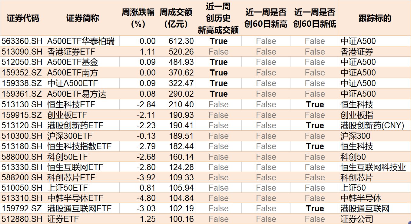 通信、证券保险等ETF受资金追捧 在行业主题ETF方面,本周净流入资金超1亿元的基金有35只,其中通信ETF、证券保险ETF和半导体设备ETF分别增加了4.11亿份、13.08亿份和7.2亿份,净流入资金12.12亿元、12.05亿元和10.79亿元。 ![]() 在资金流出方面,本周有35只行业主题ETF净流出逾1亿元,其中军工龙头ETF、军工ETF和证券ETF份额分别减少26.84亿份、7.54亿份和6.9亿份,分别净流出资金18.78亿元、9.35亿元和8.34亿元。 值得注意的是,近期证券保险ETF(512070)持续获资金追捧,基金份额创上市新高。 ![]() 证券保险ETF(512070)基金份额变化 有分析指出,国家金融监督管理总局发布的《关于调整保险公司相关业务风险因子的通知》下调了沪深300、红利低波和科创板等长期持仓资产风险因子,有助于培育耐心资本并支持科技创新。该政策的实施有望持续推动中长期资金入市,提升保险资金的权益配置能力。 另外,近期火爆的军工板块遭遇资金抛售,军工龙头ETF(512710)、军工ETF(512660)基金份额均快速回落。 ![]() 军工龙头ETF(512710)基金份额变化 ![]() 军工ETF(512660)基金份额变化 在券商看来,展望2026年,军工行业将迎来需求刚性化、结构高端化与财务健康化的关键转折,核心判断有五:一是订单确定性显著增强;二是需求结构加速向新质战斗力和消耗性作战能力倾斜;三是军贸成为第二增长曲线,体系化出口打开高端市场天花板;四是军民融合深化,商业航天、低空经济、核聚变等方向实现“军技民用、双向赋能”;五是财务质量全面改善,现金流与盈利能力进入上行通道,估值逻辑从主题博弈转向基本面定价。 18只ETF周成交额超100亿元 本周,股票型ETF和跨境型ETF成交额超100亿元的ETF有18只。 ![]() 其中,A500ETF华泰柏瑞周成交额超600亿元,多只中证A500相关ETF周成交额创新高。另外,本周多只港股相关ETF创近60日新低。 有券商表示,近期A股经历阶段性调整后,当前已具备适当乐观的基础,可积极布局春季躁动行情。岁末年初,机构再配置需求释放与资金回流,有望持续改善市场流动性、提振交易活跃度,跨年攻势已逐步启动。内外环境共振下,2026年A股跨年配置行情有望提前启动,为春季躁动行情奠定良好基础。 3只ETF下周上市 基金重仓股向来是投资者关注的热点,但是主动管理型基金的重仓股浮出水面,通常都有一定的滞后性,而ETF布局的标的却是非常明确的,通过跟踪新上市ETF,通常可以发现近期热点个股,新上市ETF带来的增量资金也值得关注。 目前有3只ETF披露下周上市,跟踪标的为港股通互联网、工程机械、科创板芯片设计等。 ![]() 目前有4只ETF披露下周发行,跟踪标的为科创板芯片设计、食品、创业板新能源、电力公用事业等。 ![]() 全新妙想投研助理,立即体验 (文章来源:每日经济新闻) |