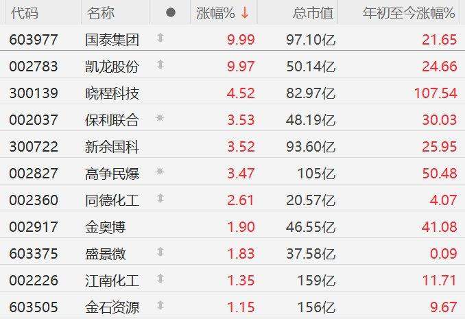 格隆汇12月22日|A股市场民爆概念股集体活跃,其中,国泰集团(603977)、凯龙股份(002783)涨停,晓程科技涨超4%,保利联合、新余国科(300722)、高争民爆(002827)涨超3%,同德化工(002360)涨超好2%。