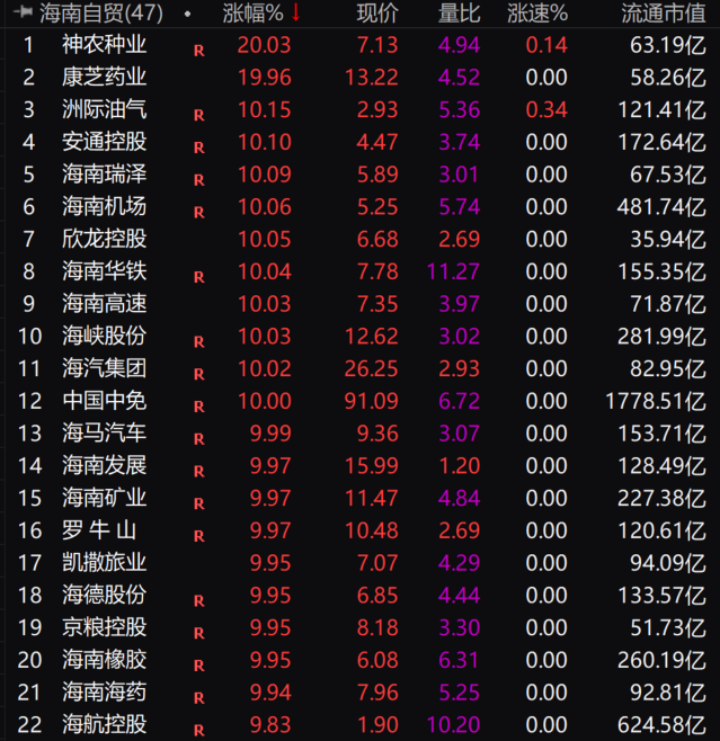 海南自贸再度爆发! 12月22日早盘,海南自贸板块全线爆发,一度22只股票封死涨停板。神农种业、康芝药业、洲际油气、安通控股、海南瑞泽、海南机场等率先涨停。 ![]() 与此同时,海南自贸概念的热度再度飙升。《海南封关“零关税”带来哪些红利》一文冲上百度热搜第三位。市场情绪可能由此点燃。 利好冲上热搜 12月18日,海南自贸港全岛封关运作正式启动。3万多平方公里的海南岛,8个对外开放口岸及10个“二线口岸”监管设施悉数启用。 随后,央视新闻一则《海南封关“零关税”带来哪些红利》的报道冲上热搜。报道指出,这个全球面积最大的自贸区顺利封关运作的背后,是每个细节都被“盘到包浆”的较真。 报道指出,2020年以来,三张“零关税”清单持续扩容,到封关前,共包含了1900多个税目的货物。封关后,海南自贸港“零关税”清单一口气从1900多个税目扩至6600多个,约占全部商品税目的74%,这比封关前提高了近53个百分点。 与此同时,据三亚市商务局数据,封关首日全市免税销售额达1.18亿元;据海口海关统计,首日“一线”进口“零关税”享惠货物3.6亿元,主要为原油、航空器材等,“二线”监管内销加工增值免关税货物1468.9万元,免征关税80.8万元,涉及医疗器械、药品、食品等品类。 随着热度飙升,市场也有了反应。今天早上,海南自贸概念持续拉升,神农种业拿下20%涨停,海马汽车、康芝药业、海南机场、欣龙控股、海南瑞泽等二十余股涨停,随后,“免税一哥”中国中免涨停,免税店概念股再度爆发。 ![]() 利好有多大? 政策红利释放催生的消费活力,全岛封关落地后,海南自贸港“零关税”商品税目比例由21%提升至74%,增加至约6600个,基本覆盖主要生产设备与原材料,预计可为相关企业降低约20%的进口税负成本。 开源证券认为,制度层面降本增效将持续改善经营主体成本结构,提升货物贸易自由化与便利化水平,并增强市场活跃度。从消费端看,政策红利将进一步放大海南在旅游与消费领域的吸引力,有利于带动旅游消费及相关零售业态扩容升级。 同时,跨境电商与加工增值政策导向明确,进口原料或半成品在海南加工、增值超过30%后销往内地可免征进口关税,在降低企业成本的同时引导商业模式向制造升级与品牌打造延伸。 湘财证券认为,海南封关政策推动“一线放开、二线管住、岛内自由”的海关监管制度,大幅扩容零关税商品目录,显著降低商品成本并丰富SKU,有利于吸引消费回流。免税零售运营商、高端消费品及百货零售商、现代物流与供应链服务商是主要受益方。免税龙头将受益于客流量、客单价和毛利提升,具备全球采购和运营能力的头部企业有望整合资源。国内品牌如服装鞋帽、茶叶等首次被允许进入离岛免税销售,为国货高端化提供窗口。 国泰海通认为,海南自贸区“零关税、低税率、简税制”将加速区域经济与相关产业发展,有望拉动客货流动。海南作为岛屿省份,航空承接约80%进出岛旅客。预计2025年海南岛内三大机场旅客吞吐量将首次突破5000万人次,创历史新高;境外航线旅客吞吐量全年将突破240万人次,同比增长30%。“十四五”时期,海南持续提升机场保障能级,未来岛内三个机场将保障年旅客吞吐量6800万人次,加快打造面向太平洋、印度洋的航空区域门户枢纽,持续拓展跨洲际等中远程航线,提升至欧美、大洋洲、中东等地区的通达率。近期观察封关后区域客流热度持续提升。