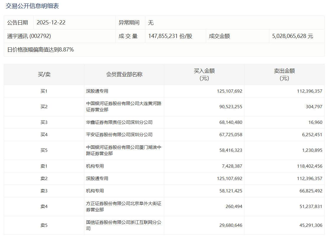 通宇通讯今日涨停,成交额50.28亿元,换手率44.35%。盘后龙虎榜数据显示,深股通专用席位买入1.25亿元并卖出1.12亿元,有2家机构专用席位净卖出1.20亿元。陈小群席位净买入9021万元。